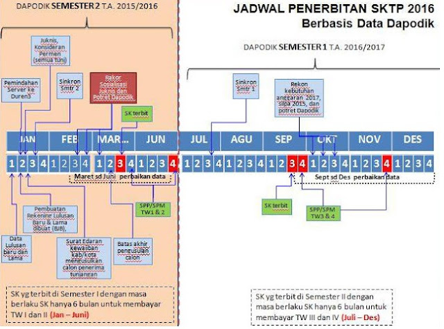 Jadwal untuk penerbitan SK TPG pada semester 2 tahun ajaran 2015/2016 direncanakan pada tanggal 3 Maret 2016 dan perbaikan data guru yang belum valid pada periode ini mulai bulan Maret sampai dengan bulan Juni 2016. Sedangkan untuk penerbitan SK TPG semester 1 tahun ajaran 2016/2017 pada tanggal 3 Juli 2016 dengan masa perbaikan sampai Desember 2016.